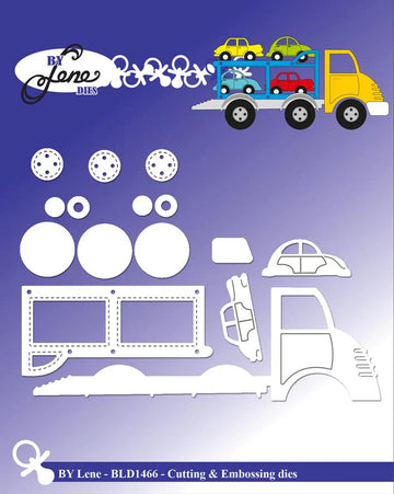 Sæt med otte dele. Sættet samles til en legetøjslastbil med små biler på lastbilsladet. Samlet...