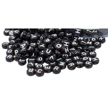 med hvide bogstaver på sorte perler