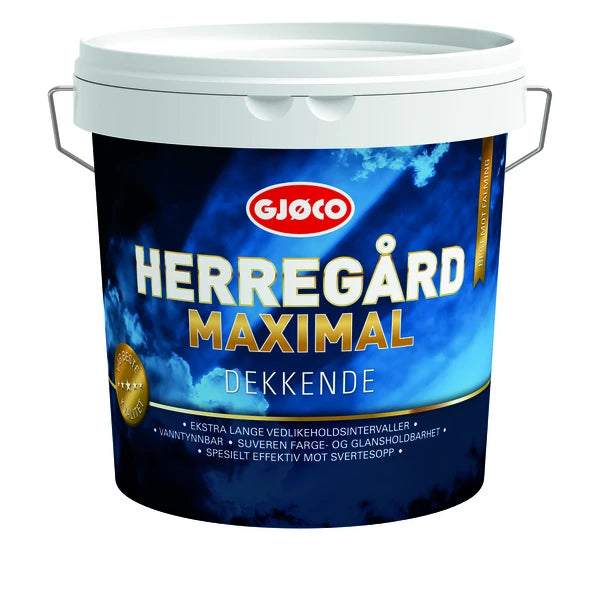 Herregård Maximal er en emulsionsmaling baseret på ren akryl og vandfortyndbar alkyd. Indeholder filmbeskyttende midler mod sort svamp.