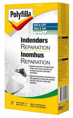 Polyfilla Indendørs Husrep er en gipsbaseret pulverspartelmasse til reparation af små revner og huller på pudsede og andre indendørs overflader.
