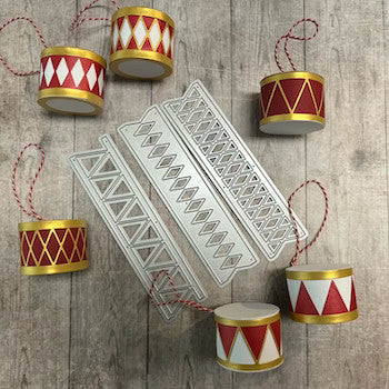 Sættet indeholder 3 dies - Et helt nyt pynte design til trommen, hvor der er små trekanter fra top og bund. Derudover er der også tynde streger der følger kanten på det nye design og det originale design, så man f.eks. kan lave guld eller sølv kanter på trekanterne.