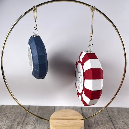 Ca. Ø7 x D2,4 cm Flad julekugle - lille fra Dan Dies indeholder 4 dies - 2 ens "appelsin både" og 2 18-kanter. For at samle julekuglen skal der i alt bruges 18 "appelsin både", så de 2 ens dies gør at du hurtigere kan få skåret ud til dine kugler. Der skal også bruges 2 store 18-kanter som forside og bagside. Den mindre 18-kant kan bruges som pyntelag hvis man har lyst. Brug det f.eks. til et billede. Den samlede kugle har en diameter på ca. 7 cm og en tykkelse på ca. 2,4cm.