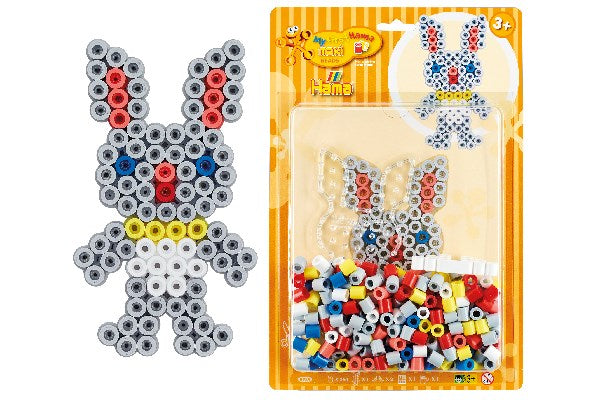 Pakken indeholder ca. 250 perler, 1 gennemsigtig kanin stiftplade nr. 8228, 2 perlefødder, vejledning og strygepapir.