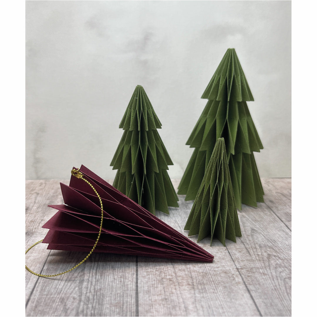 Juletræerne fra Dan Dies er lavet til at blive sat sammen ligesom vores påskeæg. Det vil sige at du skal bruge 12-15 udskæringer per træ. Træet findes i 3 forskellige størrelser, så du kan lavet et helt sæt (eller måske en hel skov?) af de fineste træer. I sættet finder du også dies til at lave en juletræsfod og en top stjerne. Begge dele kræver også flere lag. Du kan finde mere information om hvordan træet samles i vores youTube video.